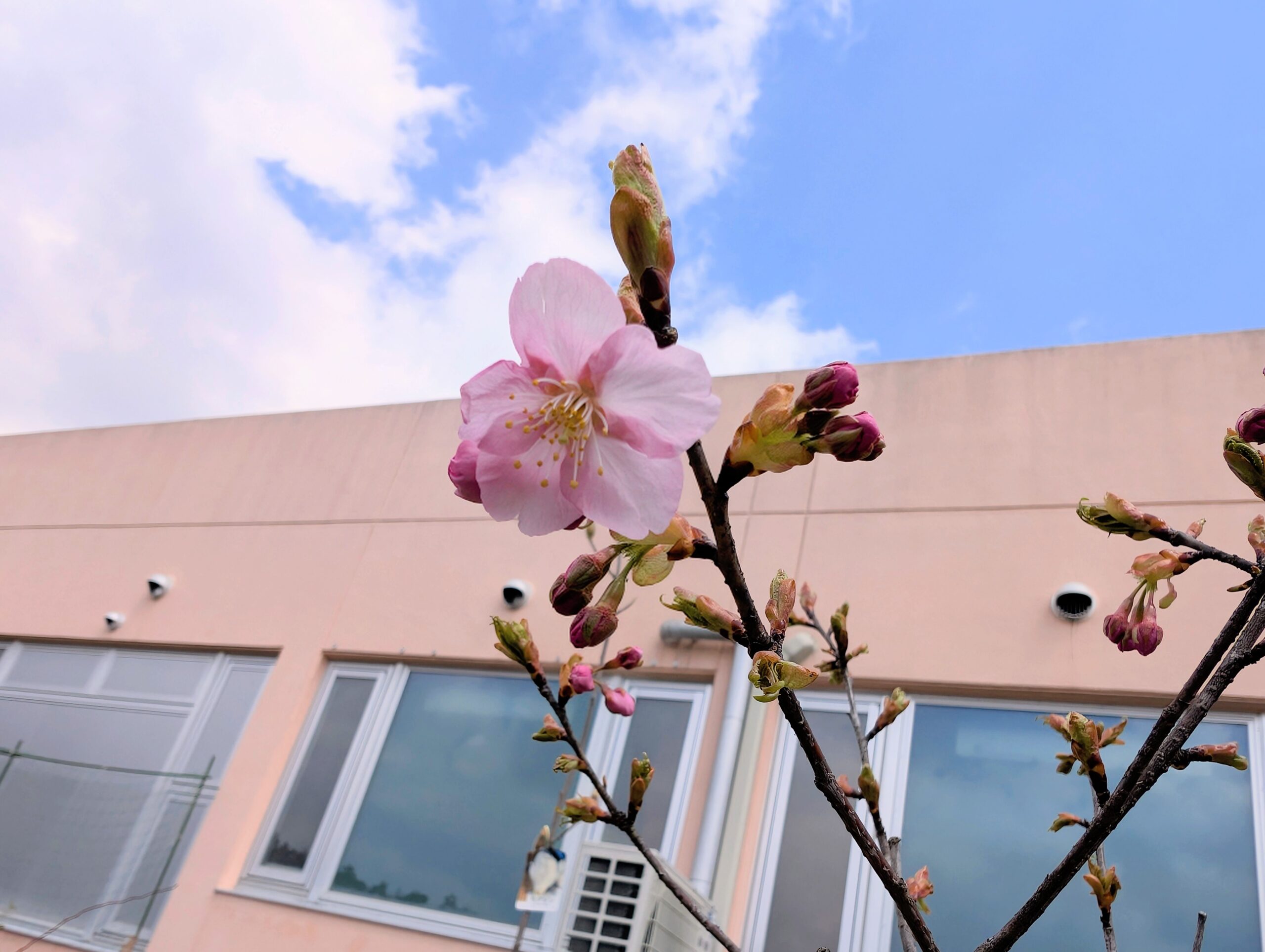一年前に河津桜の苗木を植え、なんと今回花がつきました!まだ蕾もあるのでもっと咲きそうです!